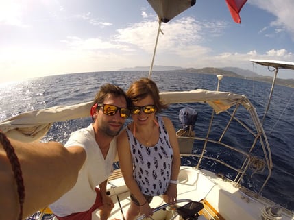 "Meer, Wind, Sonne, weisse Segel vor knallblauem Himmer - wir haben es genossen. Trotz Schräglage an Bord (laut dem wasserscheuen Oheim Thomas)."